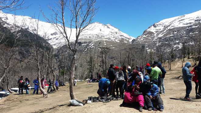 Manali: Hundreds of tourists have made a beeline to Gulaba to enjoy the snow and get respite from the scorching heat of the plains. Tourists are being allowed to go till Gulaba, about 22 km from here, on the Manali-Leh highway, which is the current snow point of Manali.As the temperature is soaring, tourists are thronging Manali.